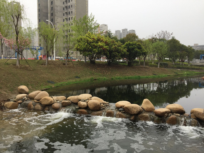 本工程造價約280萬元,主要對環(huán)形景觀帶進行岸線規(guī)整、雨水口護砌、河道清淤,并種植沉水、挺水植物,設(shè)置景觀攔水壩及人工填料,改善河道水質(zhì),提升景觀效果。