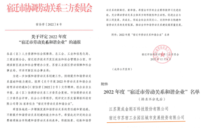 近日,園區(qū)城發(fā)公司獲評2022年度“宿遷市勞動關系和諧企業(yè)” 榮譽稱號。