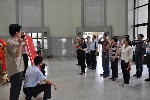 在周恩來紀(jì)念館總理雕像前,駱敏、周原敬獻(xiàn)了花籃,園區(qū)各局辦、開發(fā)公司黨員負(fù)責(zé)同志面對鮮紅的黨旗,莊嚴(yán)地舉起右拳齊聲宣誓,重溫了入黨誓詞。